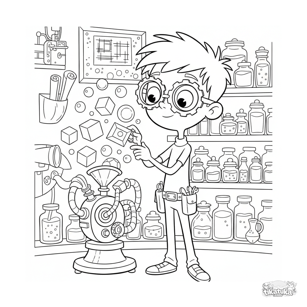Página para colorir para crianças de 7-9 anos: um jovem inventor em um laboratório secreto testa uma máquina de bolhas. Menino com óculos de engrenagem e ferramentas.