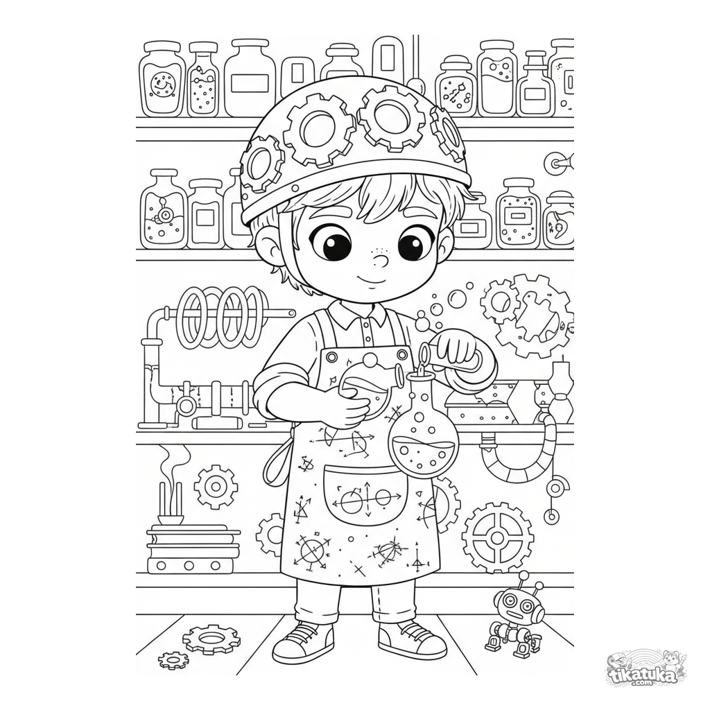 Página para colorir para crianças 7-9: um jovem inventor em um laboratório secreto conduz um experimento com poção borbulhante. Capacete de engrenagens, avental de couro.