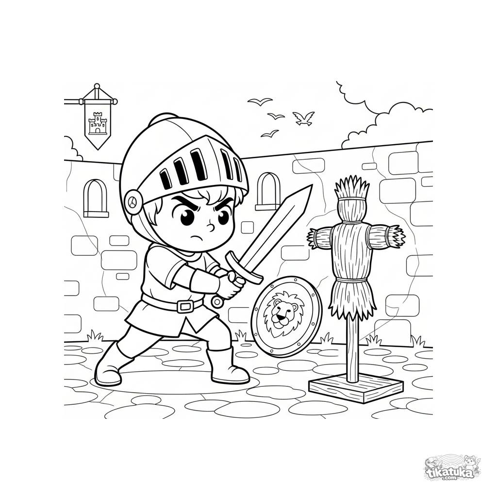 Página para colorir para meninos de 4-6 anos: um jovem cavaleiro com capacete grande pratica com uma espada de madeira atacando um boneco de palha no pátio do castelo.