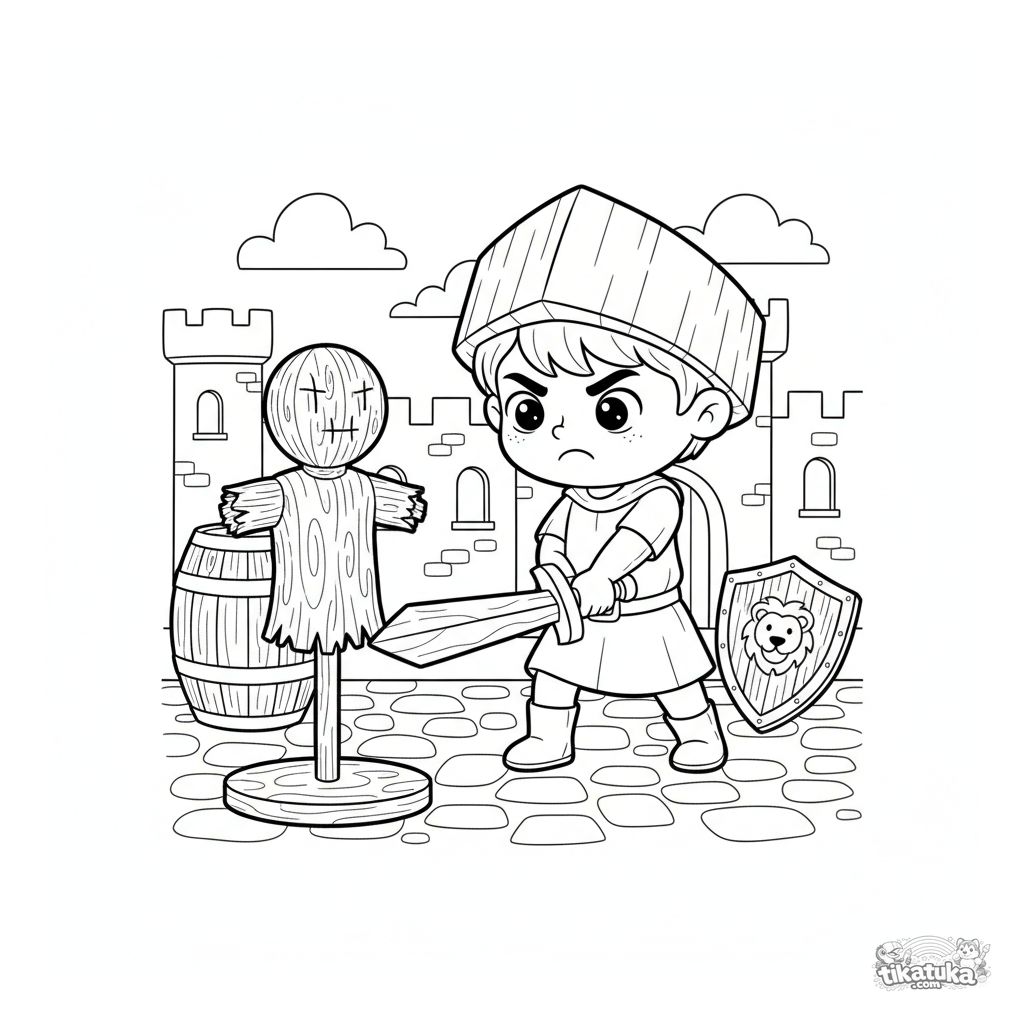 Página para colorir de um menino cavaleiro praticando com uma espada de madeira contra um boneco de palha. Para meninos de 4 a 6 anos. Cena com escudo e barril.