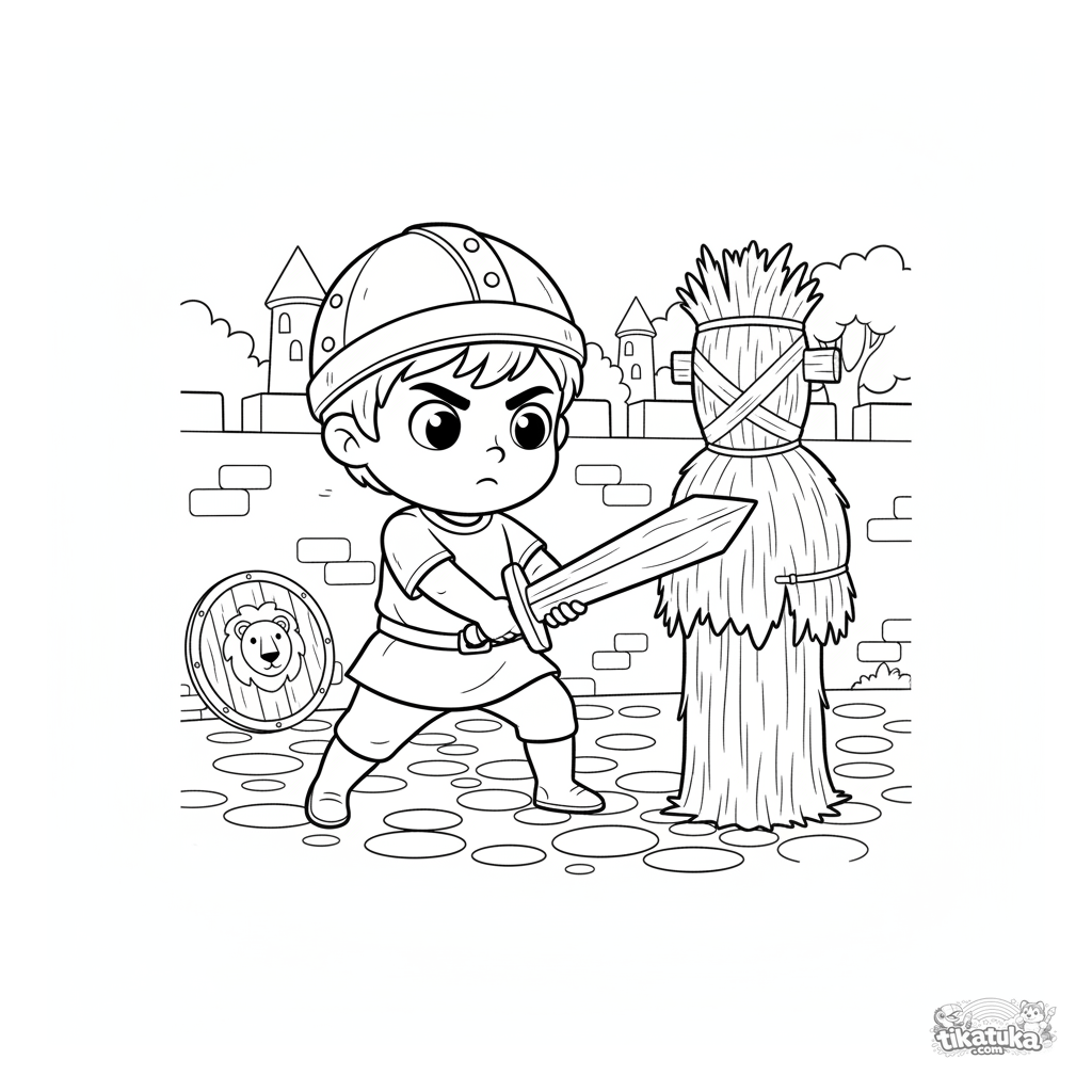 Página para colorir para meninos: um jovem cavaleiro pratica com uma espada de madeira contra um boneco de palha no pátio de um castillo. Para 4-6 anos.