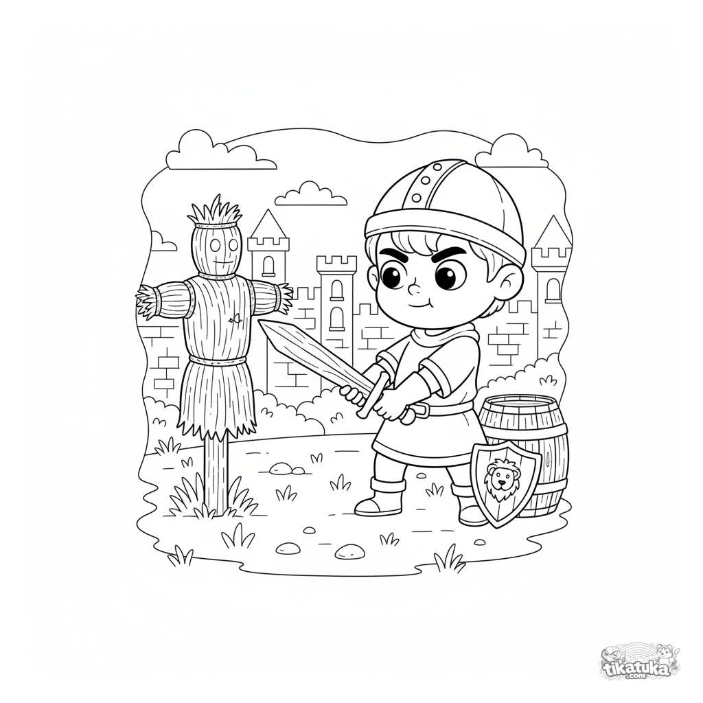 Página para colorir de um jovem cavaleiro treinando com uma espada de madeira no pátio do castelo. Para meninos de 4 a 6 anos.
