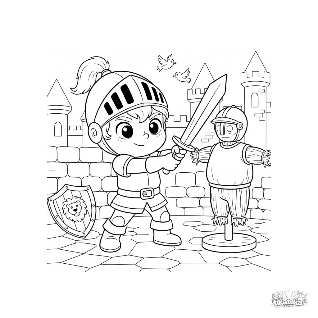 Página para colorir de um jovem cavaleiro treinando com uma espada de madeira no pátio de um castelo. Para meninos de 4 a 6 anos.