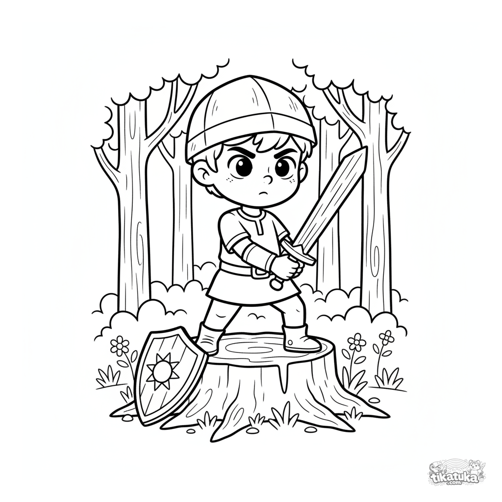 Página para colorir para meninos 4-6 anos: um jovem cavaleiro pratica com uma espada de madeira em um toco na floresta. Cena ativa e simples.
