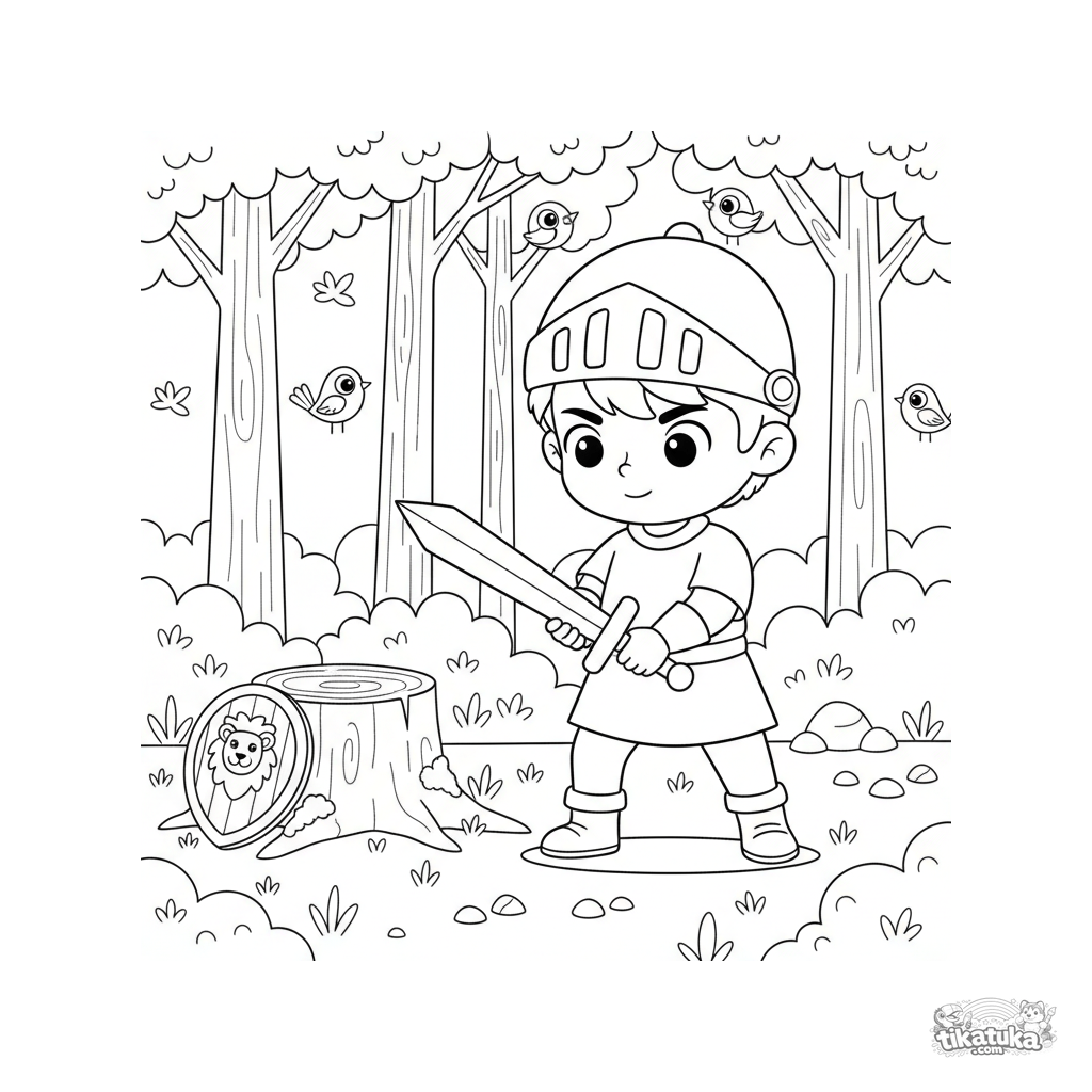 Página para colorir para meninos de 4-6 anos: um jovem cavaleiro praticando com uma espada de madeira numa clareira da floresta. Uma cena dinâmica, mas simples.