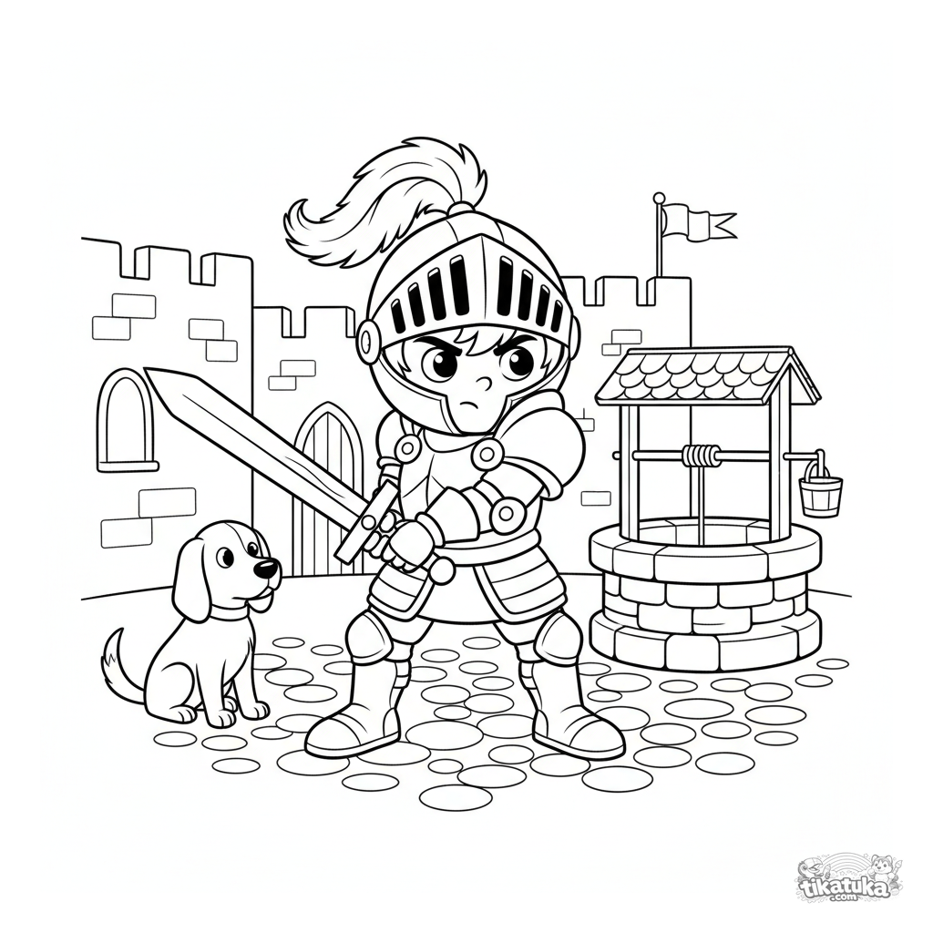Página para colorir para meninos: um jovem cavaleiro com armadura treina com uma espada de madeira no pátio de um castelo. Contornos claros e detalhes divertidos para 4-6 anos.
