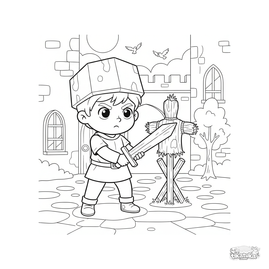 Página para colorir de um jovem cavaleiro treinando com uma espada de madeira no pátio do castelo. Cena de ação para meninos de 4 a 6 anos.