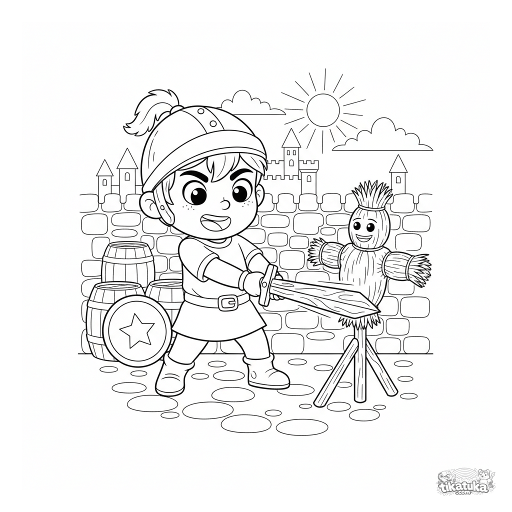 Página para colorir para meninos 4-6: um jovem cavaleiro pratica seu golpe em um boneco de palha no pátio de treino do castelo. Pose dinâmica.