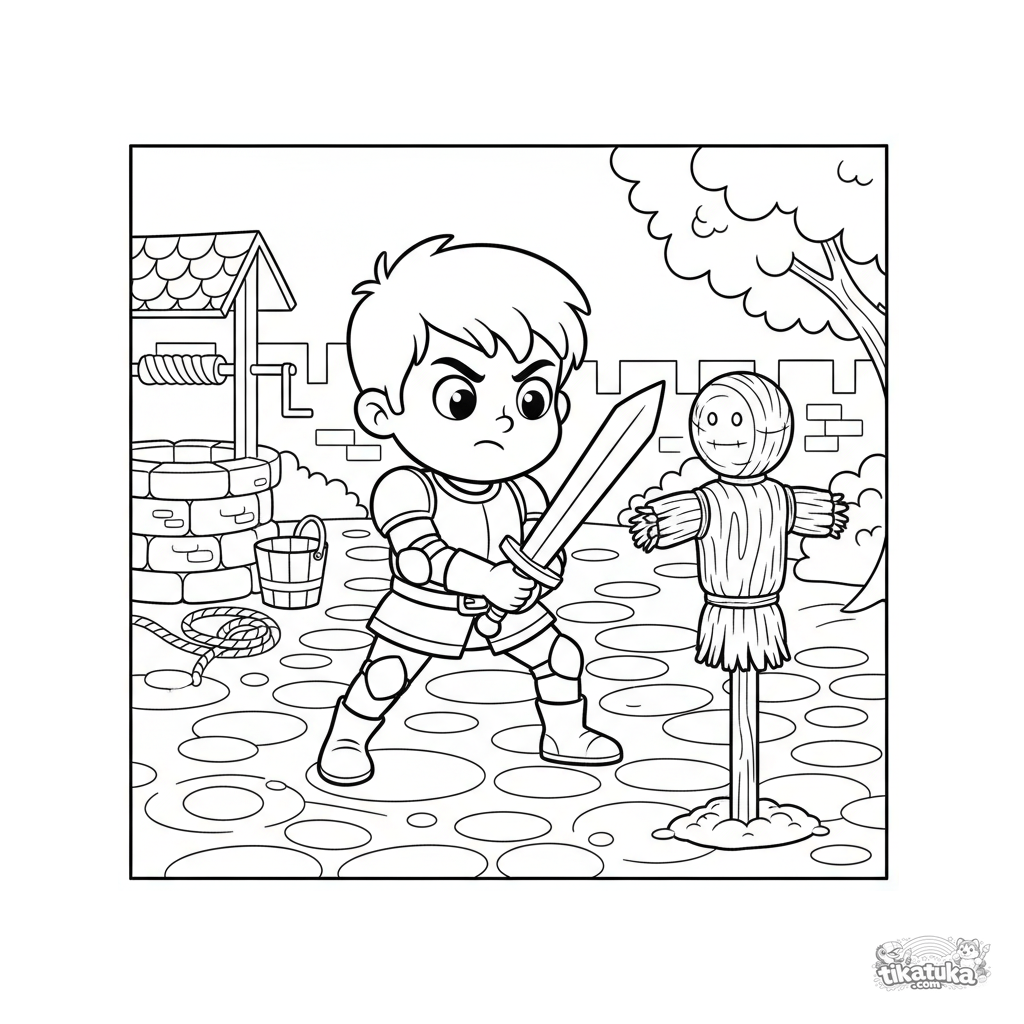 Página para colorir para meninos: um jovem cavaleiro treina com espada de madeira contra um boneco de palha no pátio do castelo. Para crianças de 5 a 8 anos.