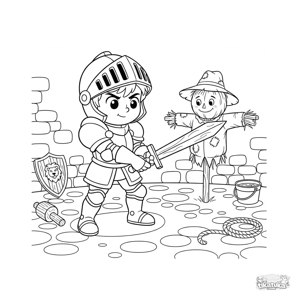 Página para colorir para meninos: um jovem cavaleiro treina com uma espada no pátio de um castelo. Para crianças de 5 a 8 anos. Com um escudo, um espantalho e acessórios medievais.