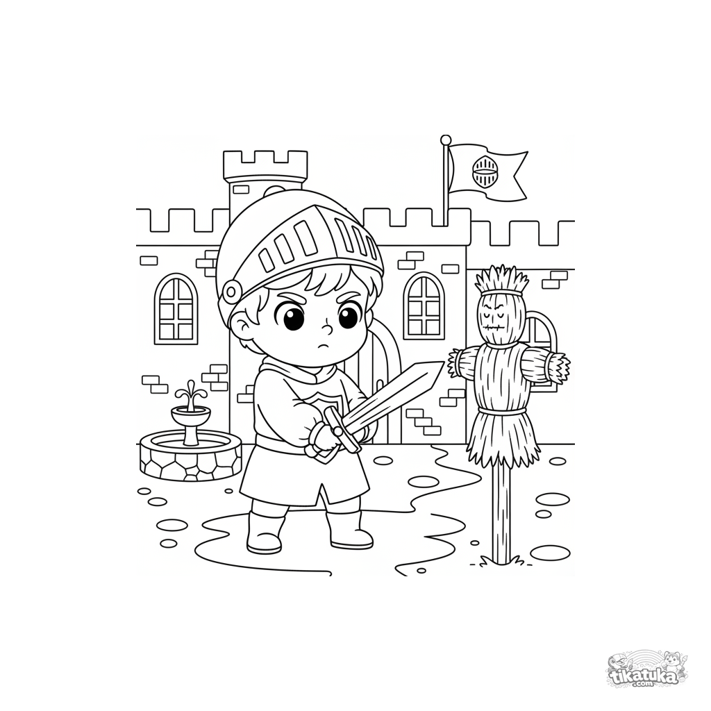 Página para colorir para meninos de 4-6 anos: um jovem cavaleiro com armadura simples pratica com uma espada de madeira em um boneco de palha no pátio de um castelo.