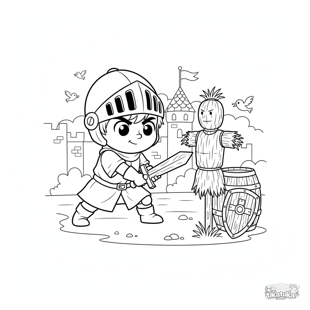 Página para colorir para meninos 4-6: um jovem cavaleiro com túnica e capacete de treino pratica um golpe com espada de madeira contra um boneco de palha no pátio de um castelo. Cena dinâmica.