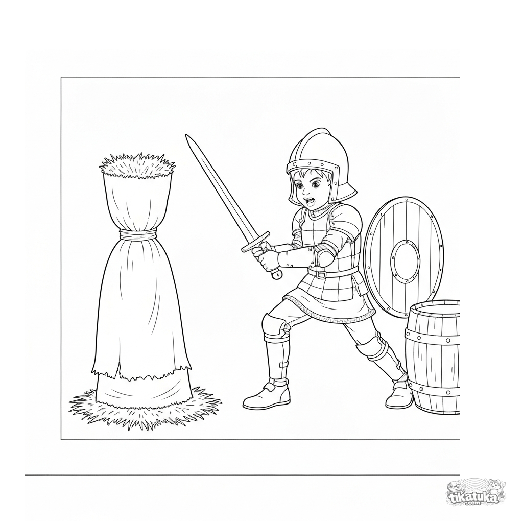 Página para colorir de um jovem cavaleiro treinando com uma espada de madeira em um boneco de prática. Para crianças de 5 a 8 anos.