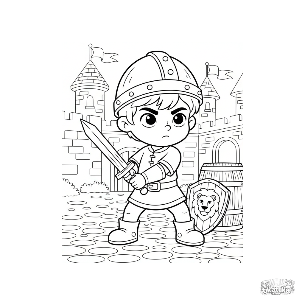 Página para colorir para meninos: um jovem cavaleiro pratica com uma espada de madeira no pátio de um castelo. Para crianças de 5 a 7 anos.