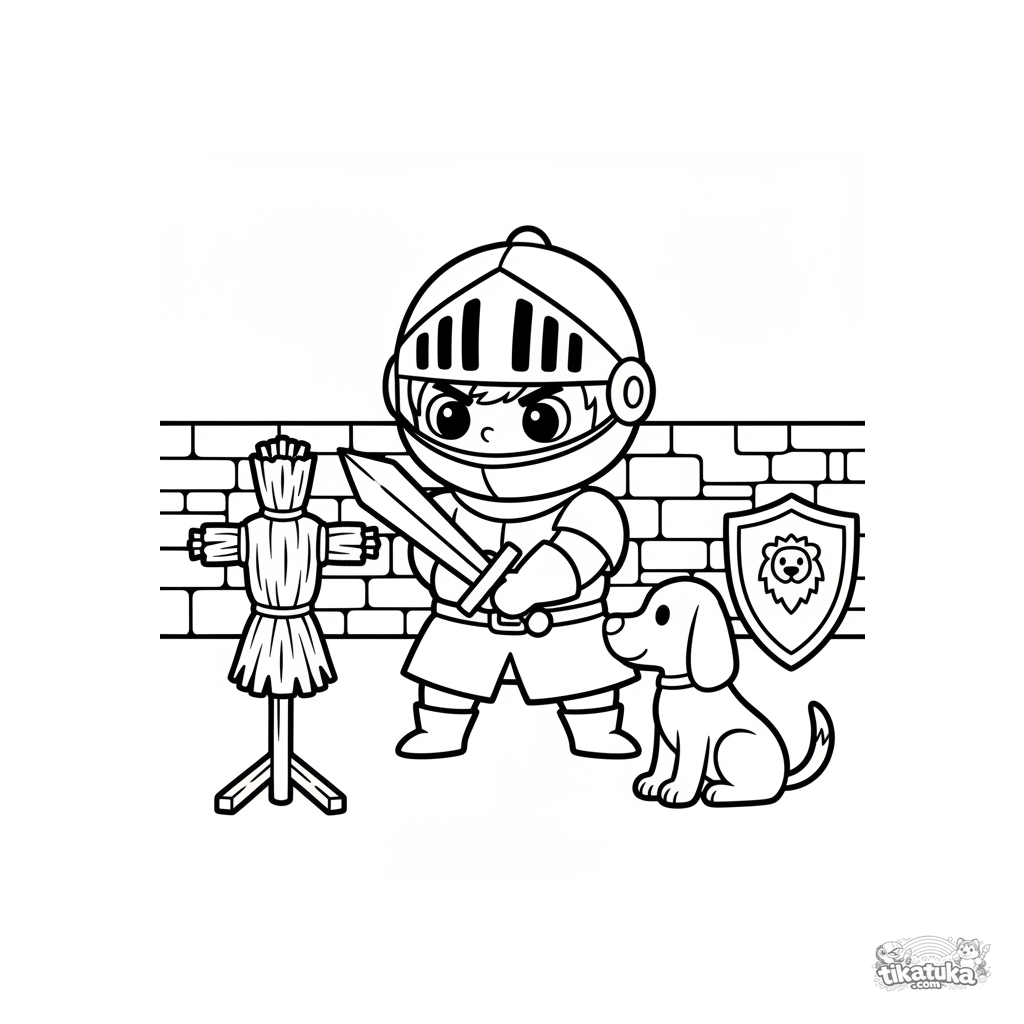 Página para colorir para crianças pequenas de 2 a 5 anos: um jovem cavaleiro pratica com uma espada de madeira contra um boneco de palha no pátio do castelo. Contornos simples.