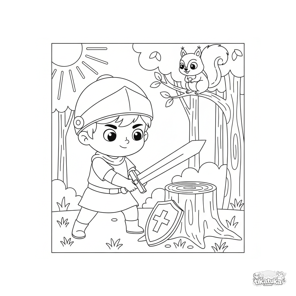 Página para colorir de um jovem cavaleiro treinando com uma espada de madeira em uma clareira. Para crianças de 5 a 8 anos.