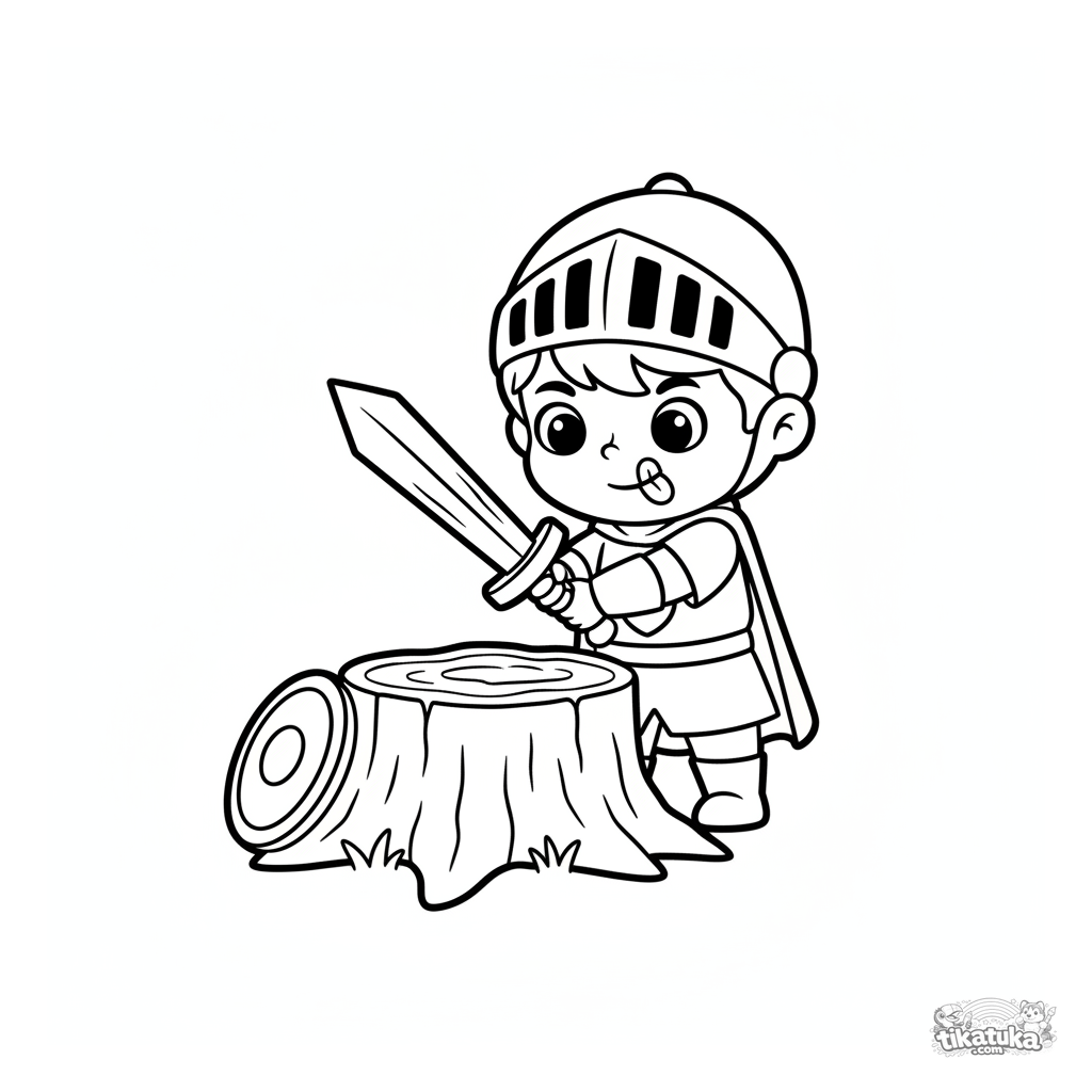 Página para colorir de um jovem cavaleiro praticando com uma espada de madeira em um toco. Para crianças pequenas de 3 a 5 anos.