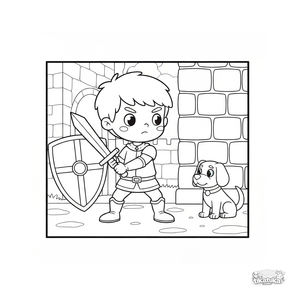Página para colorir de um jovem cavaleiro treinando com uma espada de madeira no pátio de um castelo. Para crianças de 3 a 5 anos.