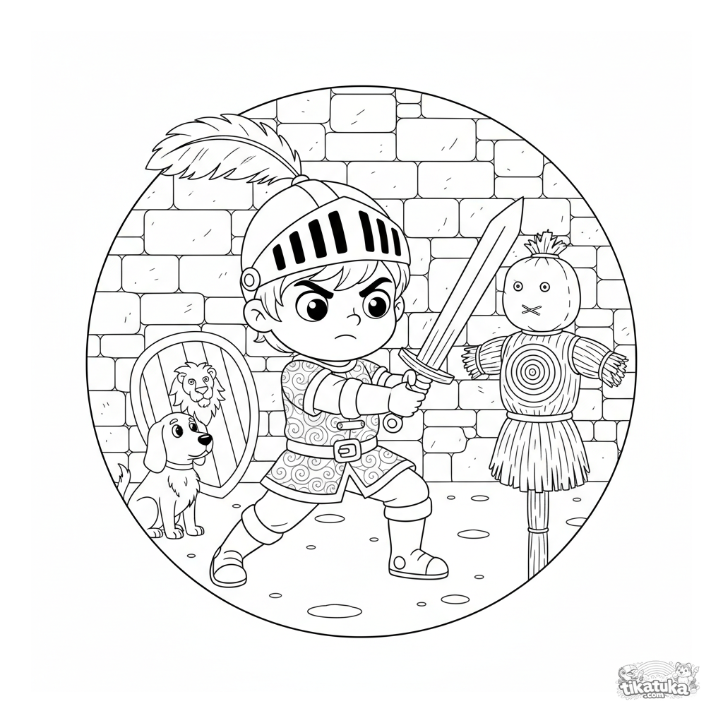 Página para colorir de um jovem cavaleiro praticando com uma espada de madeira no pátio de um castelo. Para crianças de 6 a 9 anos.