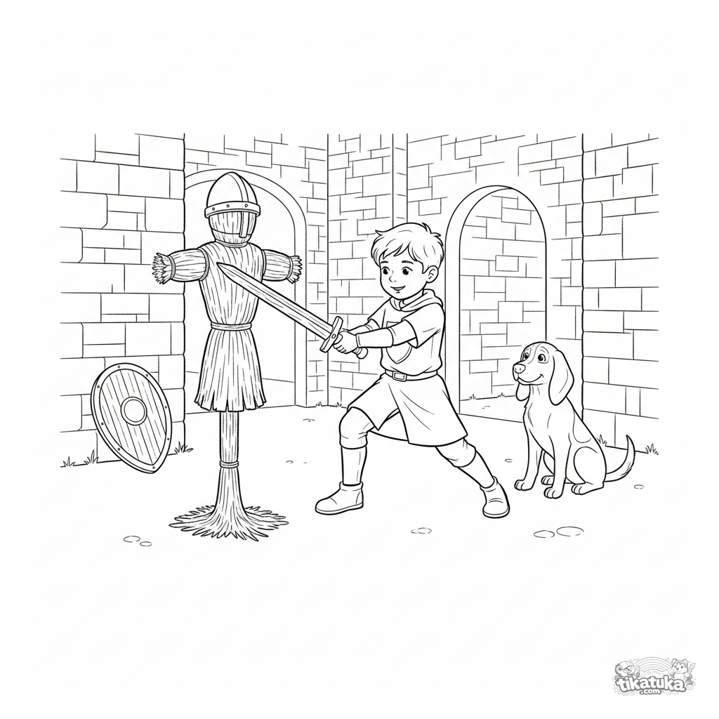 Página para colorir para crianças de 5-8 anos: um jovem cavaleiro com túnica heráldica treina com uma espada de madeira contra um boneco de palha no pátio de um castelo, observado por um cão leal.