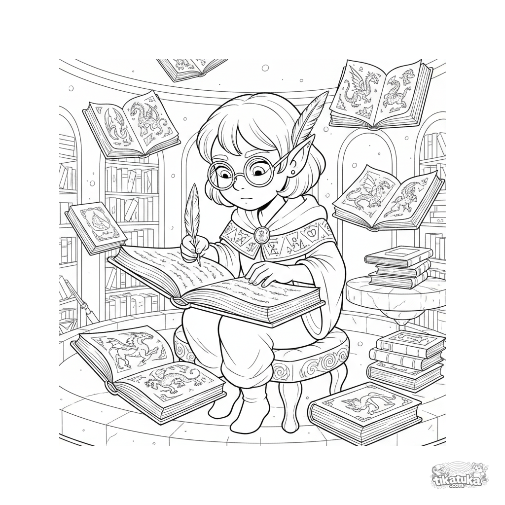 Página para colorir para crianças mais velhas 10-12: um jovem escriba elfo catalogando livros flutuantes antigos em uma biblioteca mágica circular.