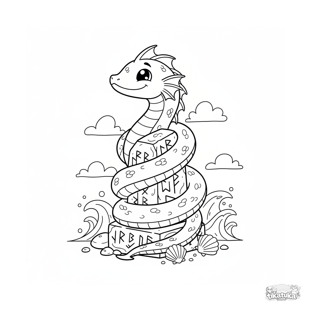 Página para colorir para crianças 7-9: uma jovem serpente marinha amigável enrola-se em um antigo monólito brilhante com runas. Pose dinâmica, detalhes de fundo.