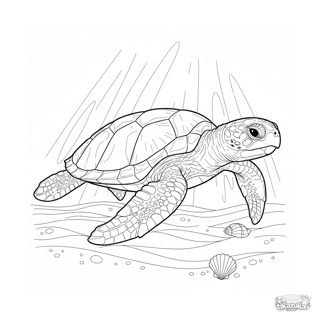 Página para colorir detalhada de uma tartaruga marinha jovem deslizando sobre o fundo arenoso em águas rasas e ensolaradas. Para crianças mais velhas de 10 a 12 anos.
