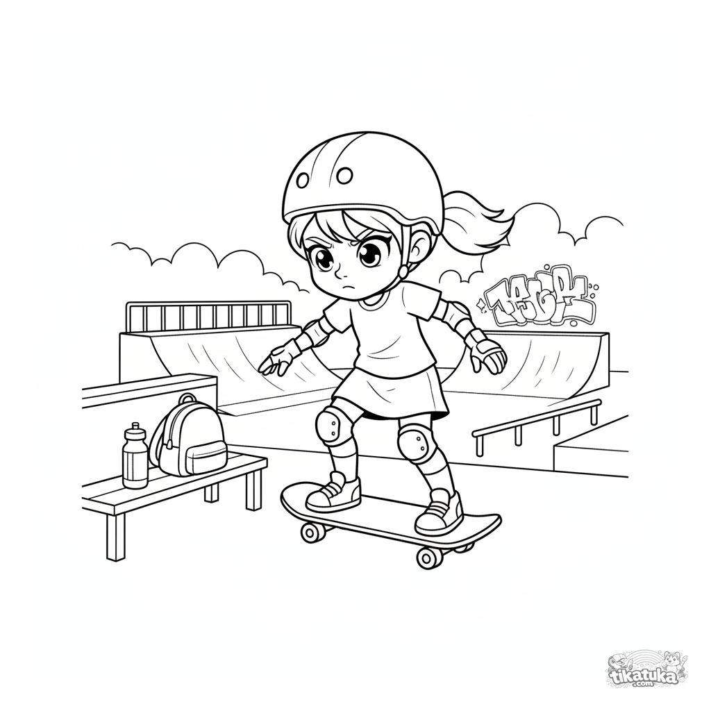 Página para colorir infantil: uma menina de skate se equilibrando numa rampa num parque de skate. Para crianças de 4-6 anos.
