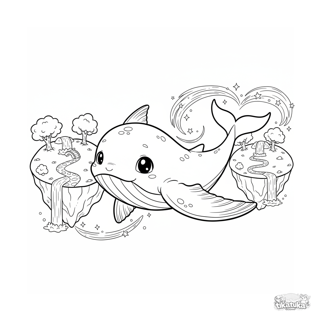 Página para colorir para crianças 7-9: um filhote de baleia celestial nada entre ilhas flutuantes nas nuvens. Cena mágica de voo e exploração, olhos expressivos, margens amplas.