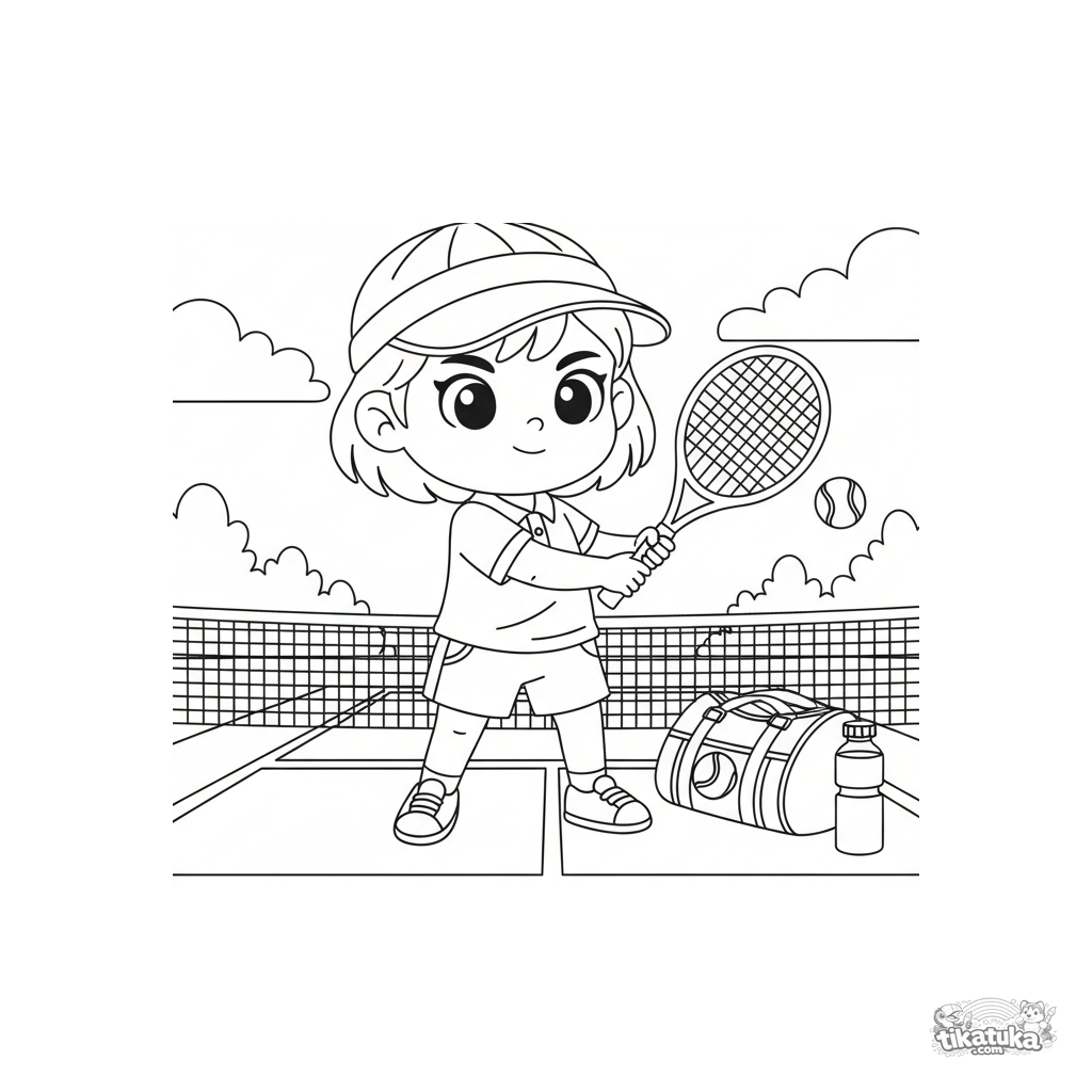 Página para colorir para crianças de 4-6 anos: um jovem tenista treina em uma quadra com rede. Vista completa da criança com raquete, bolsa e garrafa de água.
