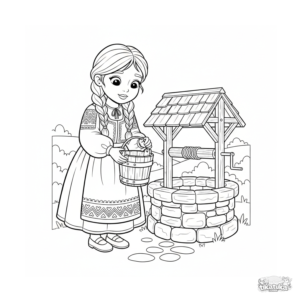 Página para colorir para crianças 4-6: uma menina com vestido tradicional tira água de um poço mágico. Formas simples e uma cena doce da vida na aldeia.