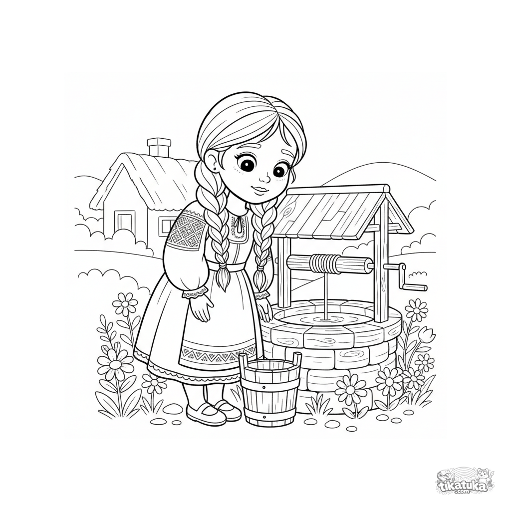 Página para colorir para crianças 4-6: uma menina com vestido tradicional junto a um poço de água viva. Formas simples, cena clara.