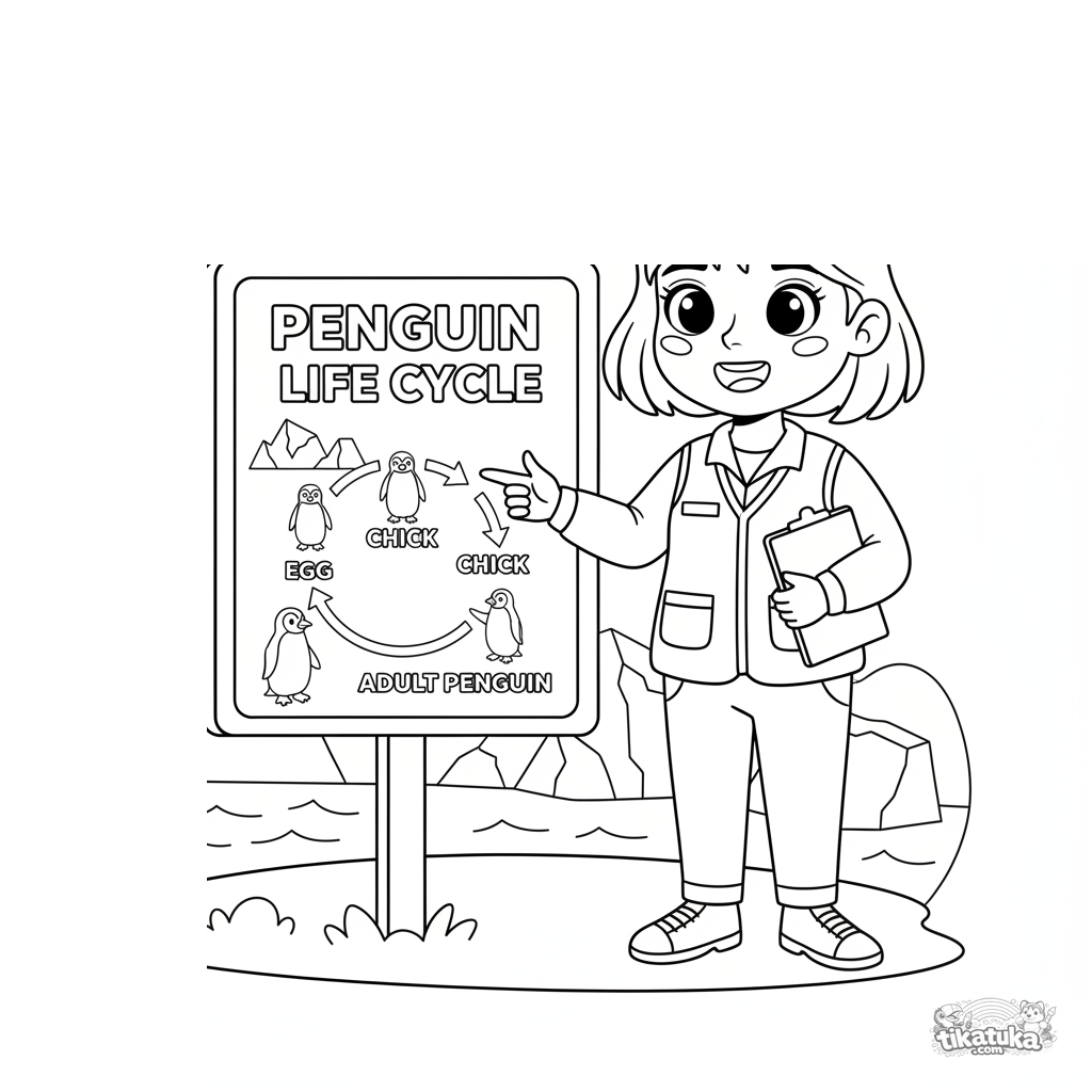 Página para colorir para crianças 4-6: um jovem tratador explica as informações do habitat dos pinguins. Aprenda sobre profissões e animais.