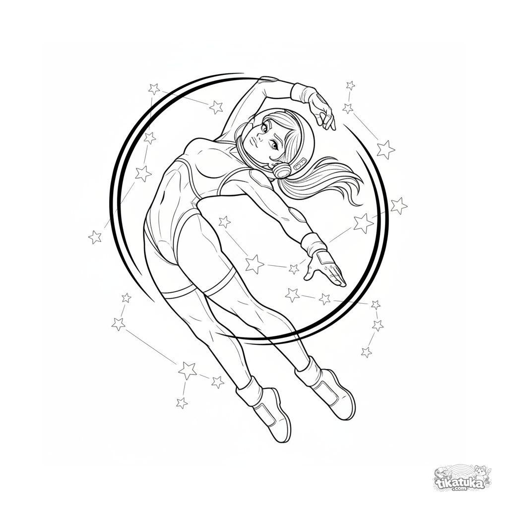 Página para colorir para crianças de 7-9 anos: um astronauta ginasta realiza um movimento complexo em gravidade zero contra um fundo de estrelas e constelações.