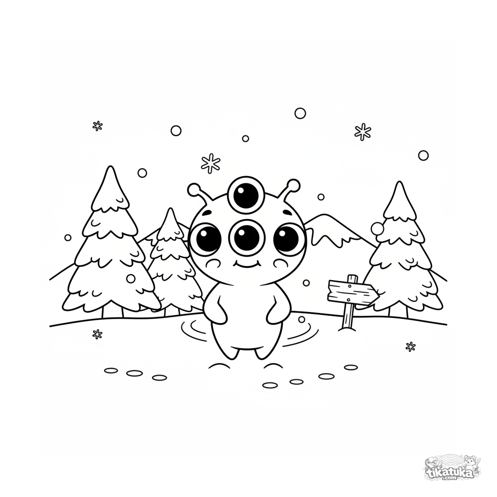 Zip, o alienígena, confuso na neve do prado. Baixe, imprima ou pinte online esta cena de fantasia e primeira neve para crianças.