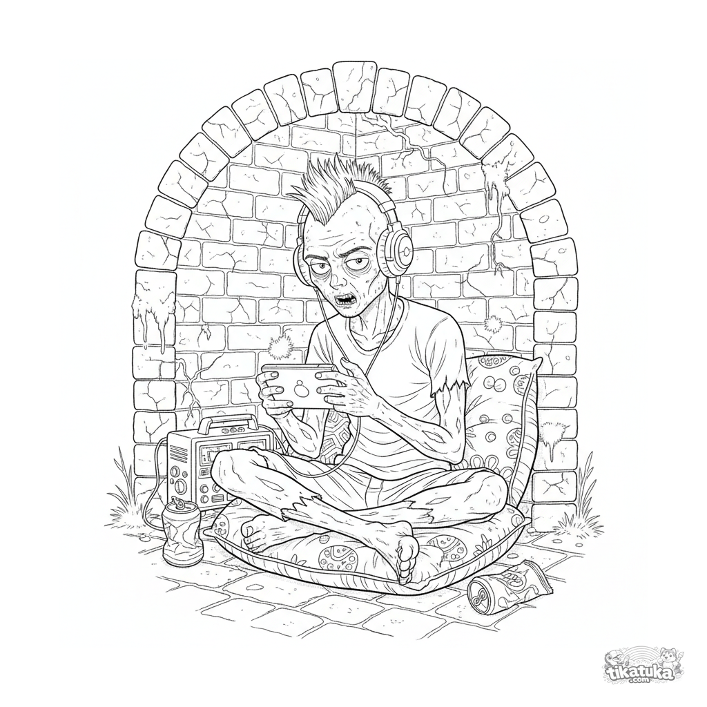 Página para colorir detalhada: um zombie adolescente jogando videogame em seu esconderijo aconchegante no esgoto. Para crianças de 10 a 12 anos. Cena com configuração e acessórios.