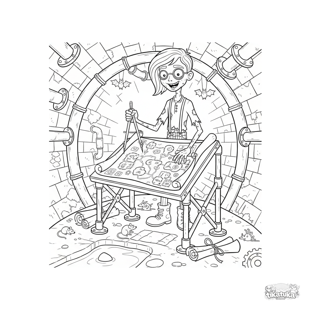 Página para colorir para crianças mais velhas 10-12: um zumbi cartógrafo desenhando um mapa detalhado do labirinto de esgotos. Cena no estilo de planta técnica.
