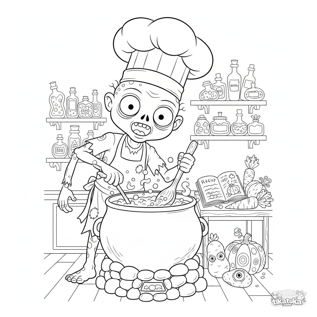 Página para colorir divertida para meninos de 7-12 anos com um chef zumbi. O zumbi amigável com chapéu de chef está mexendo algo num grande caldeirão fumegante numa cozinha assustadora.