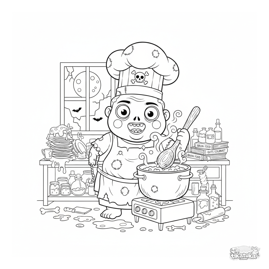Página para colorir engraçada para meninos de 4-6 anos: um chef zumbi amigável mexendo um caldeirão. Cena fofa e não assustadora, com humor.