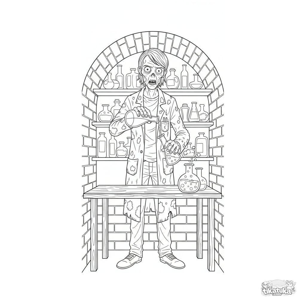 Página detalhada para colorir para crianças de 10-12 anos: um zumbi químico faz uma experiência em um laboratório subterrâneo de esgoto.