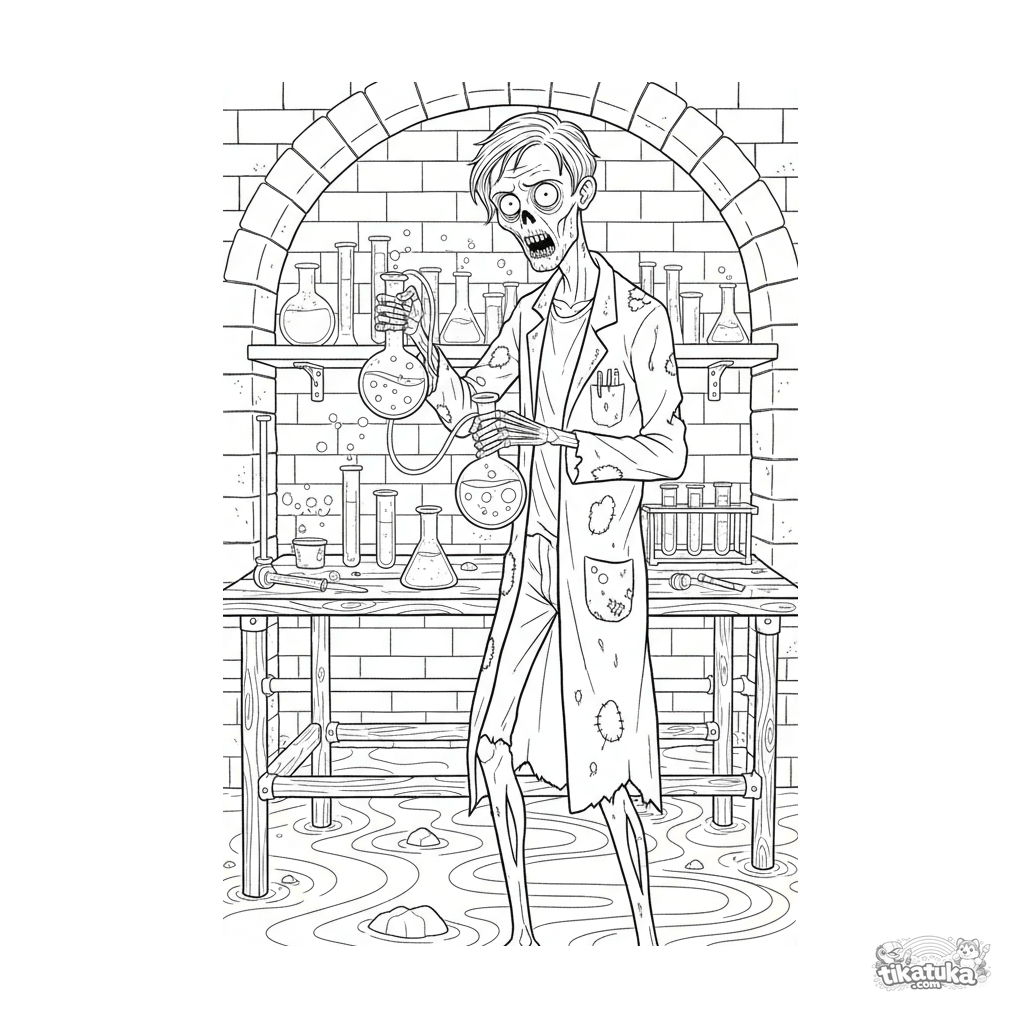 Página para colorir detalhada para crianças de 10-12 anos: um zombie químico faz uma experiência em um laboratório improvisado dentro de um coletor. Muitos detalhes e equipamentos.