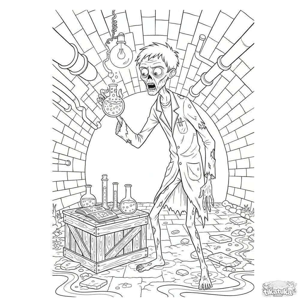 Página detalhada para colorir para crianças 10-12: um zumbi químico com um jaleco rasgado conduz um experimento com água em um laboratório subterrâneo de esgoto. Muitos elementos.