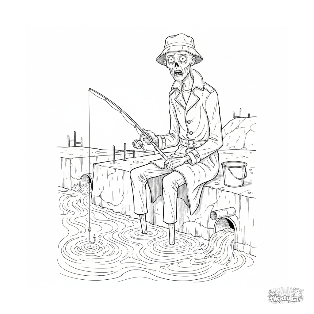 Página detalhada para colorir para crianças de 10-12 anos: um zumbi pescador realista esperando pacientemente em um canal de esgoto. Contornos claros.