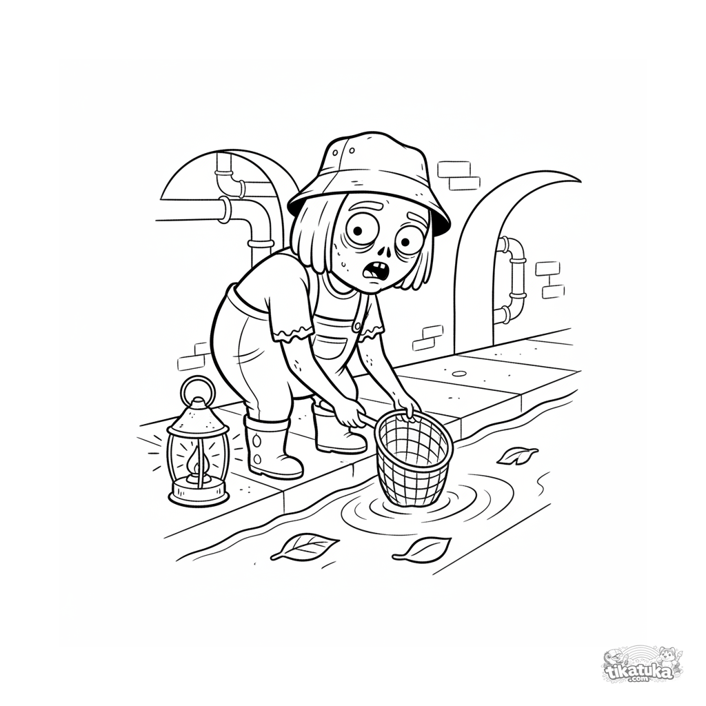 Página para colorir para crianças de 7-9 anos: um zumbi pescador lança uma rede em um canal de esgoto. Cena detalhada para meninos.