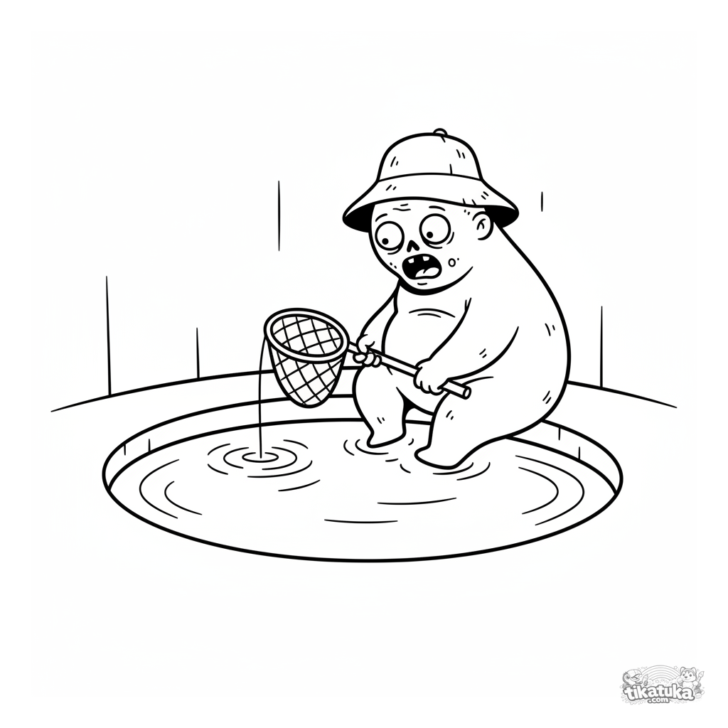 Página simples para colorir para bebês de 2-3 anos: um zombie pescador amigável sentado à beira da água em um coletor. Formas grandes, poucos detalhes.
