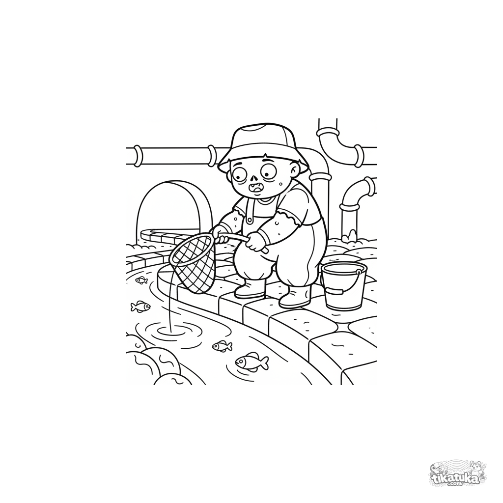 Página para colorir para crianças 4-6: um zombie pescador engraçado com botas de pesca lançando uma rede em um canal de água no coletor. Cena em estilo folclórico.