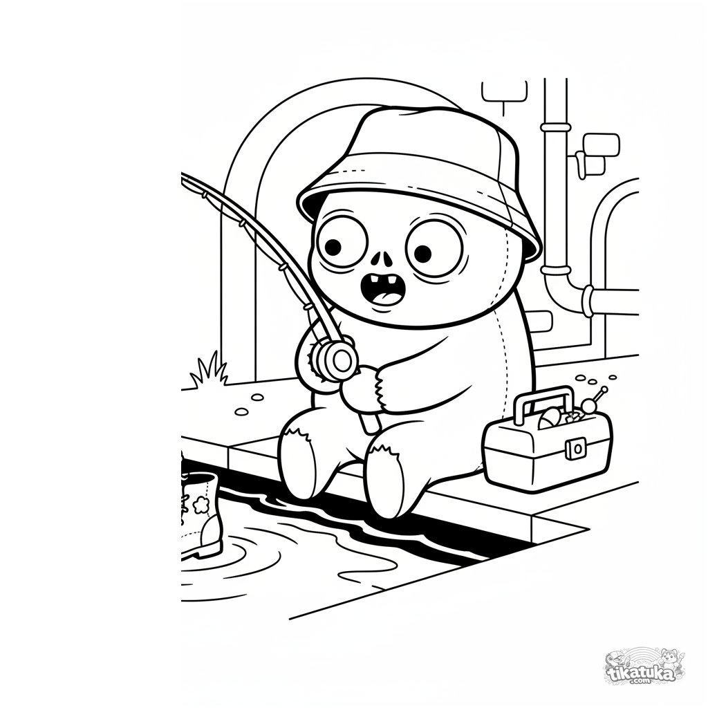 Página para colorir para crianças 4-6: um zumbi redondo e bondoso no esgoto tenta pegar uma bota velha com uma vara de pescar. Cena engraçada e simples para colorir.