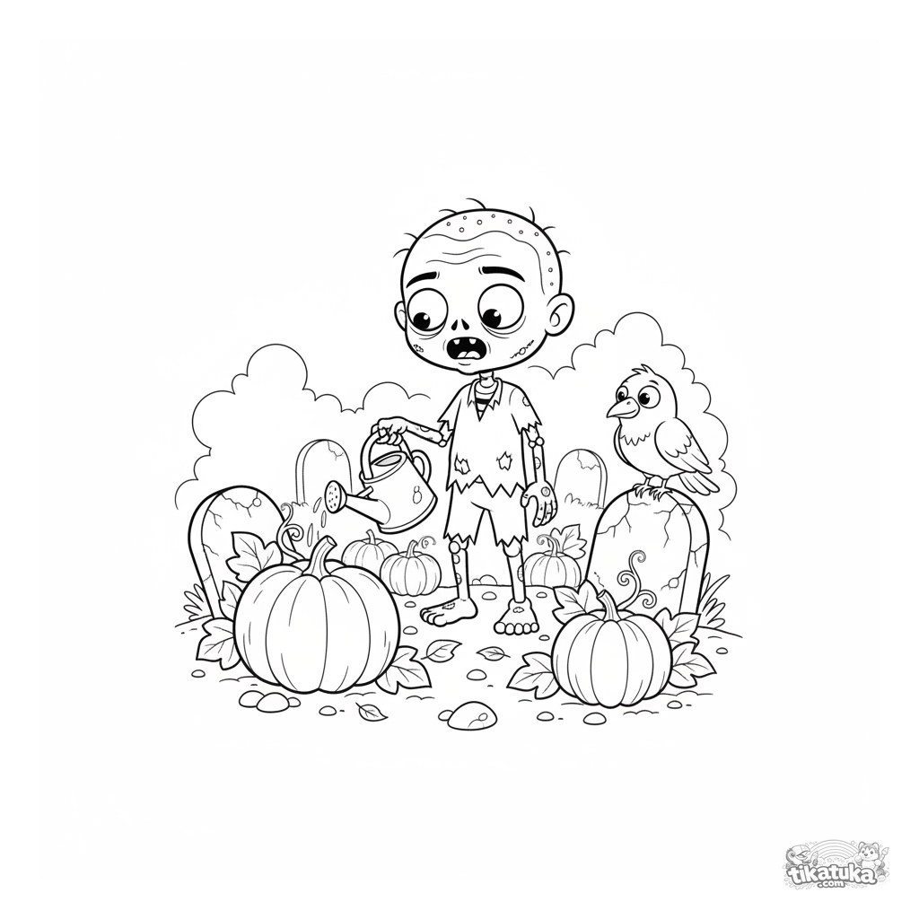 Página para colorir de um zumbi jardineiro amigável. Para meninos de 4 a 6 anos. O zumbi com um regador cuida de abóboras crescendo entre lápides antigas em um dia de outono nebuloso.