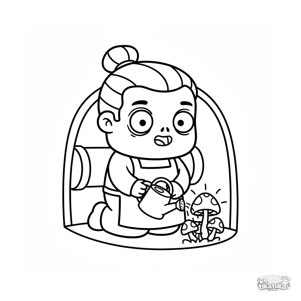 Página para colorir para crianças pequenas 2-3: um zumbi jardineiro regando cogumelos brilhantes em um nicho de esgoto. Formas muito simples e grandes.