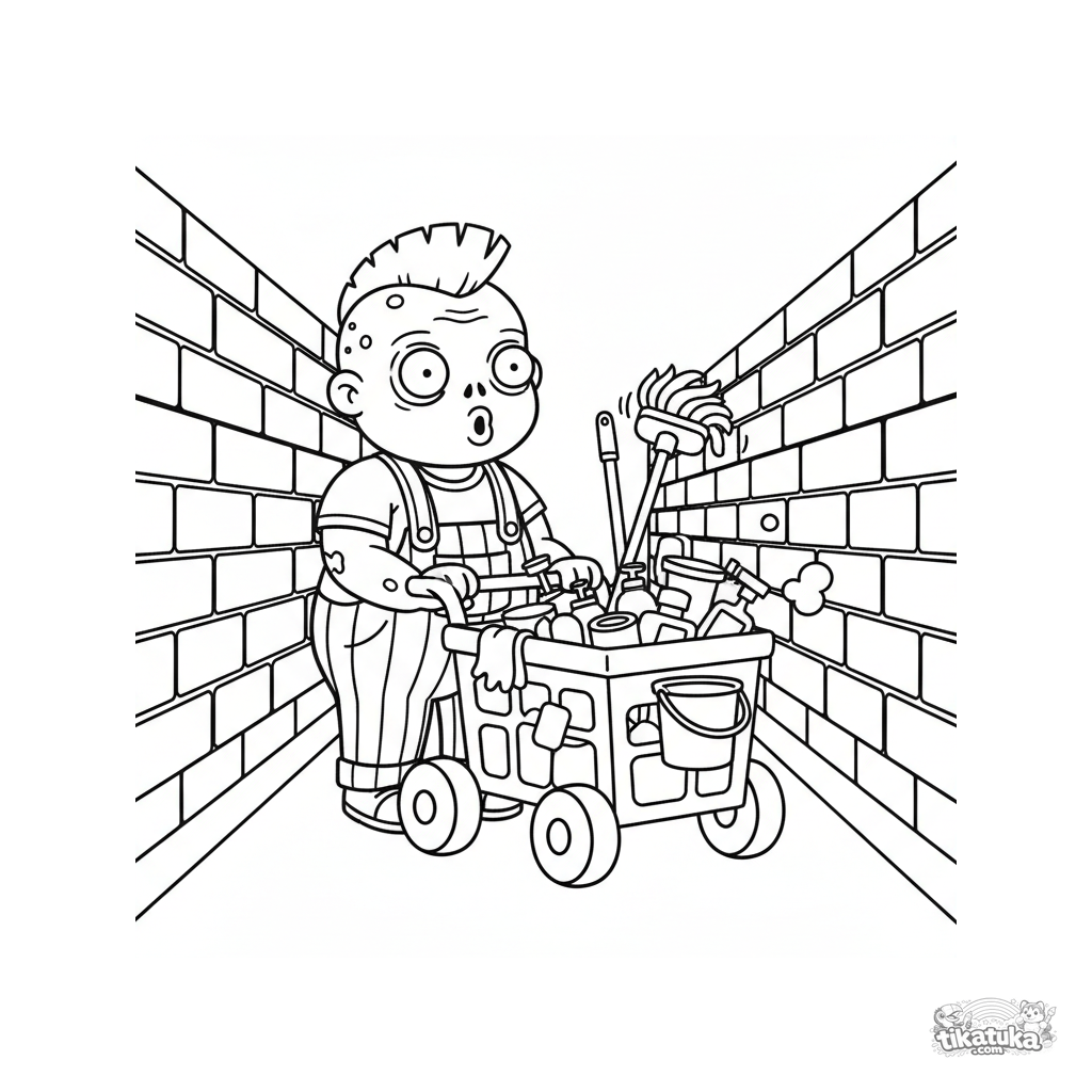 Página simples para colorir para crianças pequenas de 2-3 anos: um zumbi zelador com um carrinho em um longo corredor de esgoto. Formas grandes e claras no estilo dos anos 80.